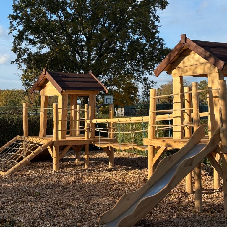 großer Kletterturm mit Hängebrücke und Schaukeln, sowie einen Kleinkindbereich mit Spielturm und Rutsche